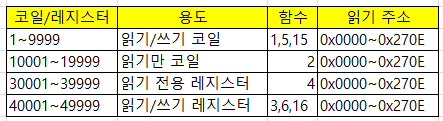 ※ 주의 - 코일과 레지스터 번호의 시작이 0번일수도 1번 일수도 있으니 반드시 메뉴얼 참고